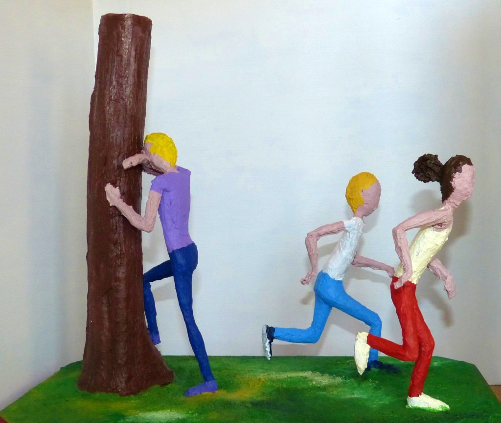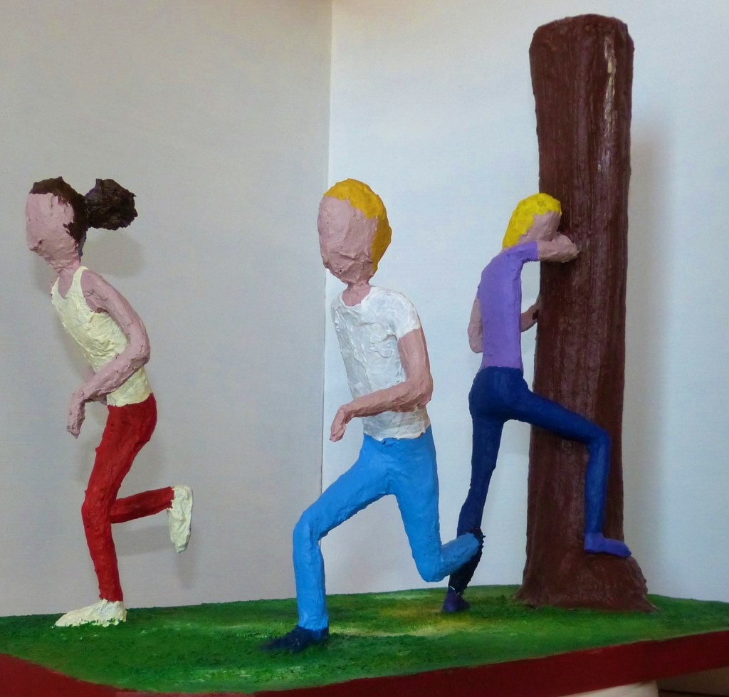 Sobre tabla MDF, figuras y tronco de árbol hechos con alambre, espuma de poliuretano y pintura acrílica.