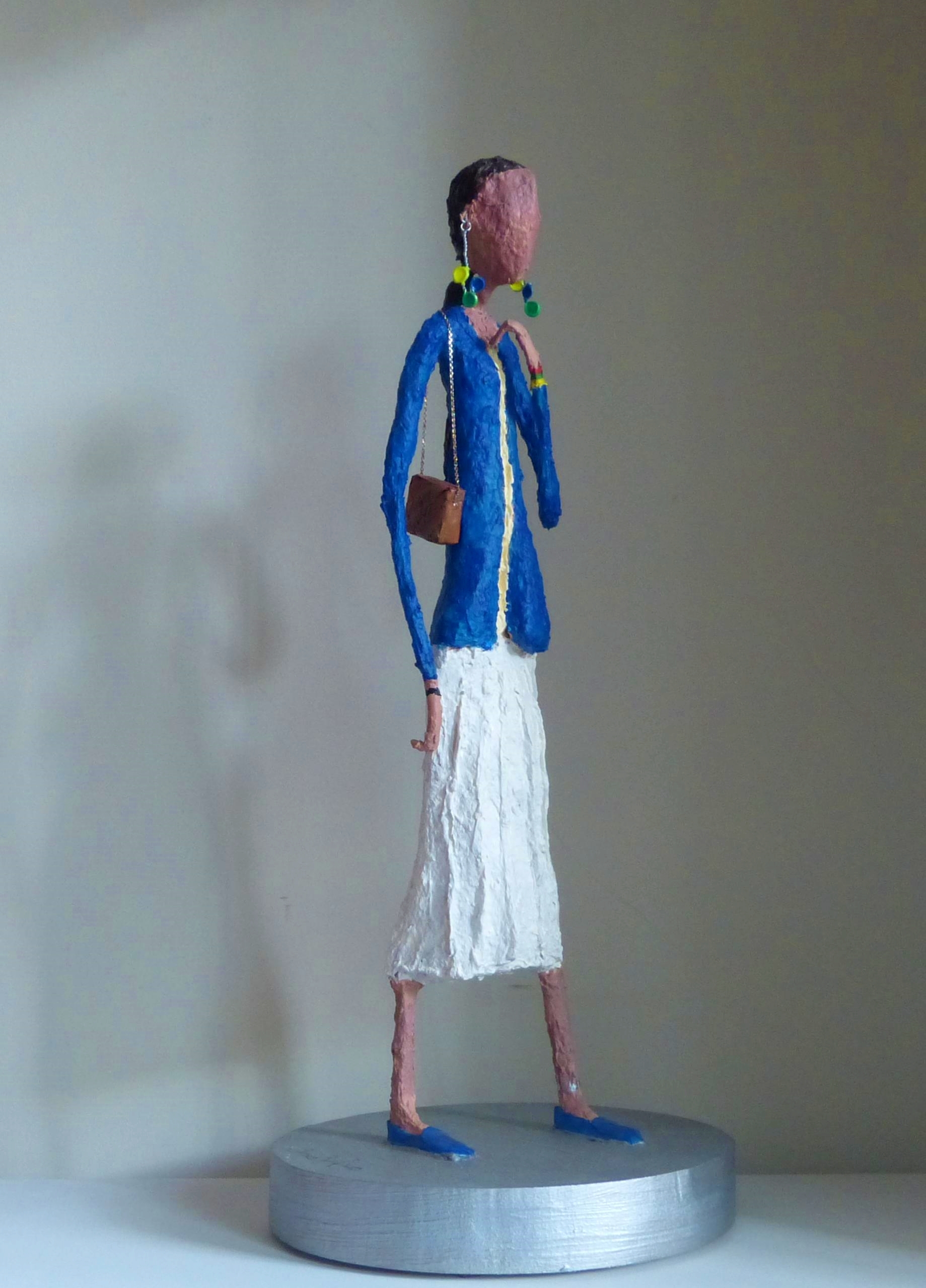 Técnica mixta: huesos de alambre, músculos de espuma de poliuretano, piel de pintura acrílica, zapatos de cinta de pintor. Adornos hechos con el mismo material y cadena de plata.
