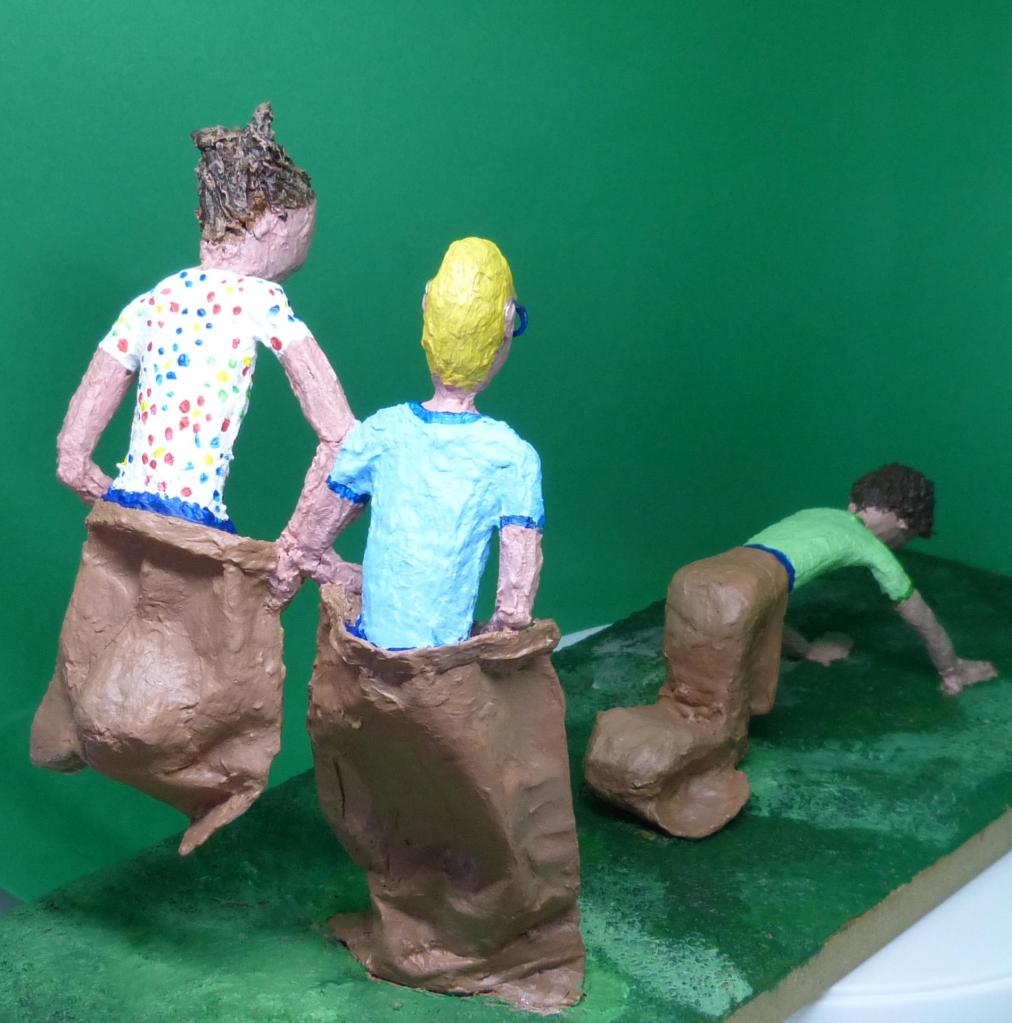 Sobre MDF pintado, figuras hechas con alambre, espuma de poliuretano, pasta acrílica, cinta de pintor y pintura acrílica.