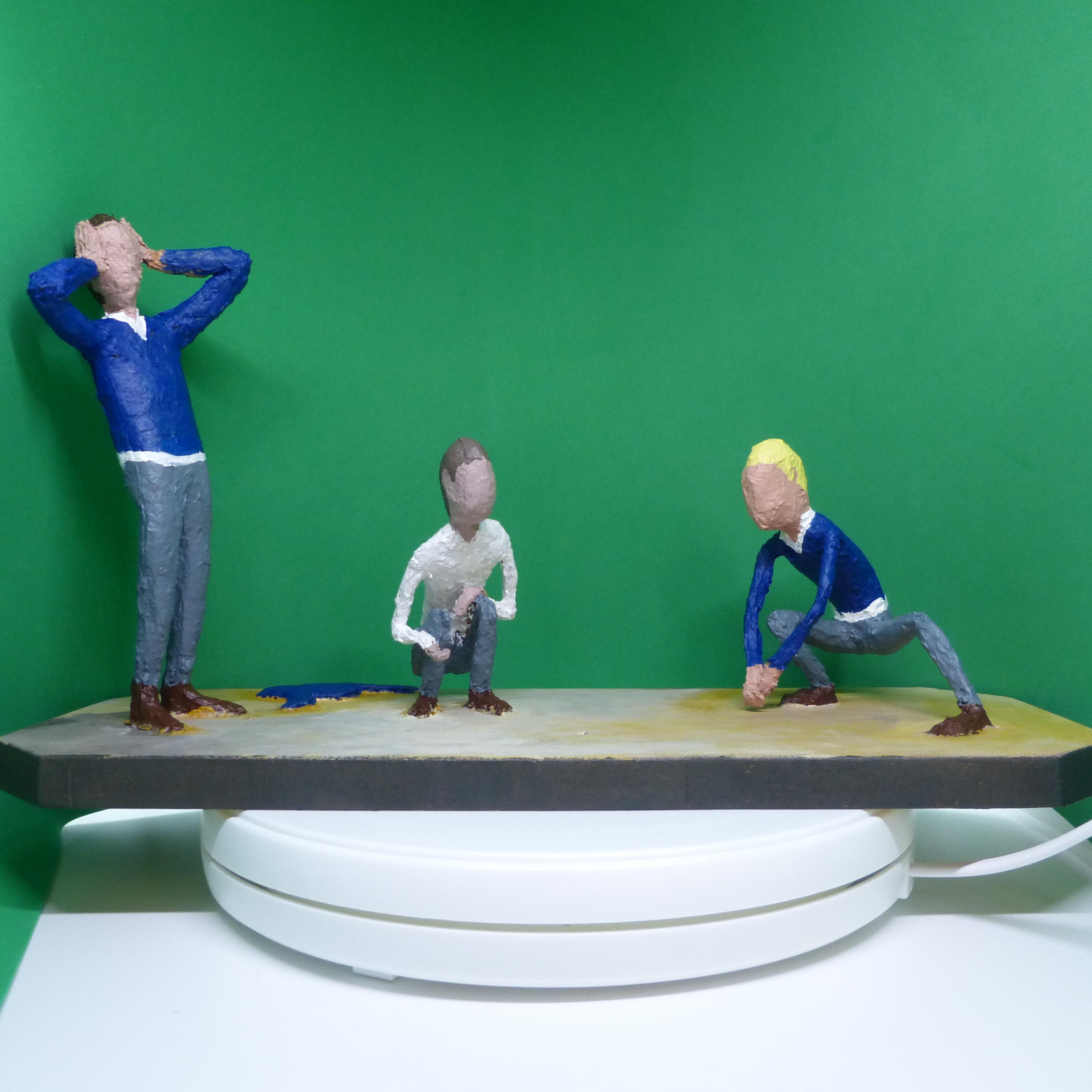 Sobre MDF pintado, figuras hechas con alambre, espuma de poliuretano, pasta acrílica, cinta de pintor y pintura acrílica.