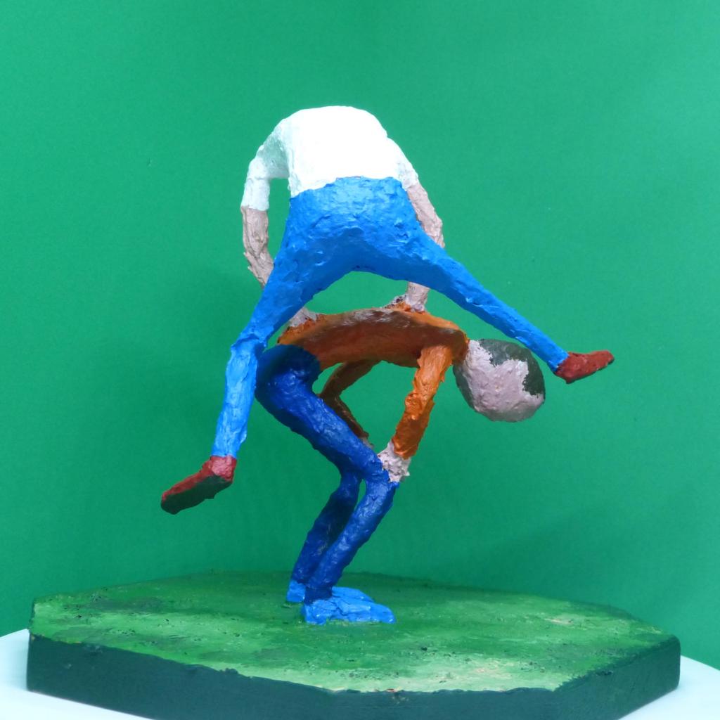 Sobre MDF pintado, figuras hechas con alambre, espuma de poliuretano, pasta acrílica, cinta de pintor y pintura acrílica.