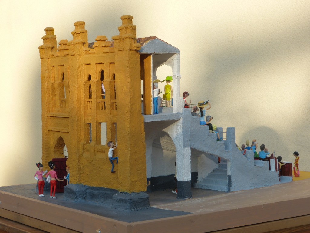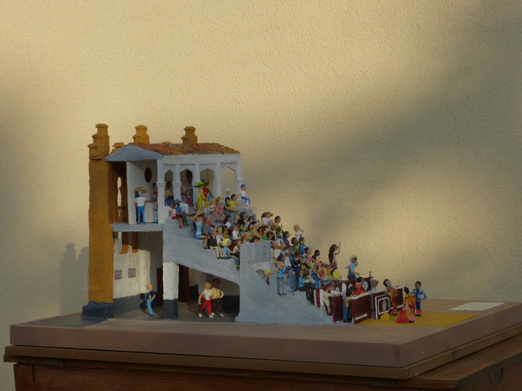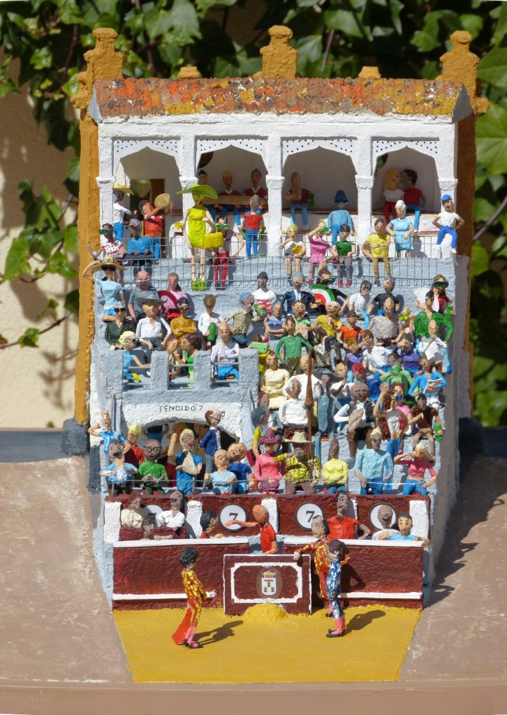 Segmento de la Plaza de Toros de Albacete. 101 figuras.Detalle de la Plaza de Toros de Albacete. Técnica mixta. 94 x 60 x 45 cm.Detalle del vigilante de la plaza en la puerta 8.Plaza de Toros de Albacete, en imagen figurada y tomada en el descanso de la corrida. Los maestros descansan, y la afición merienda. Plaza de Toros de Albacete, en imagen figurada y tomada en el descanso de la corrida. Las hermanas llegan tarde, e Ismael se cuela. Detalle del exterior de la Plaza de Toros de Albacete. Las hermanas llegan tarde, e Ismael se cuela.